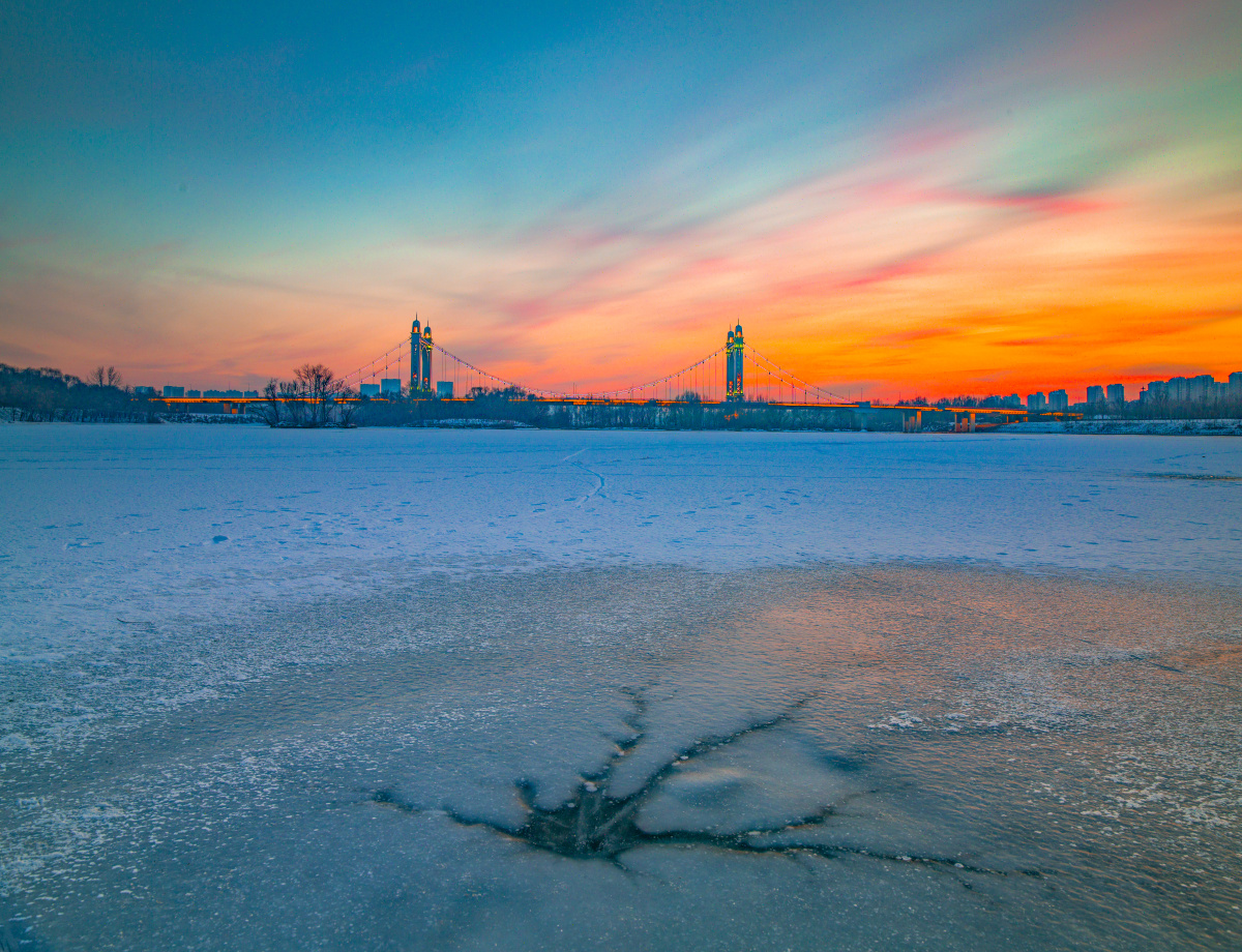 沈阳浑河流域,东塔桥段火烧云。今天是2026年1月2日,零下20多度,站在浑河冰面上,加骑行和拍摄时间超过3个多小时。也是2026年第一次拍摄,哈苏 慢门 H系28MMF4
